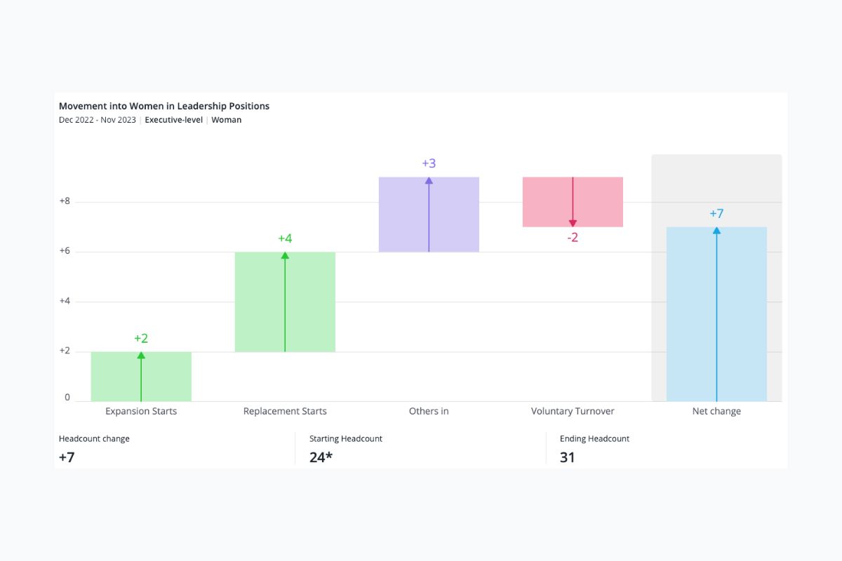 However, specific characteristics matter greatly when you track a metric like the Ratio of Women in Leadership. For example, it makes a big difference whether those women were promoted from within or hired externally, or whether women have to wait longer—and by how much—in their careers to reach a leadership position than men. This context influences the metric outcome, how you explain it, and what you decide to do about it in the future.