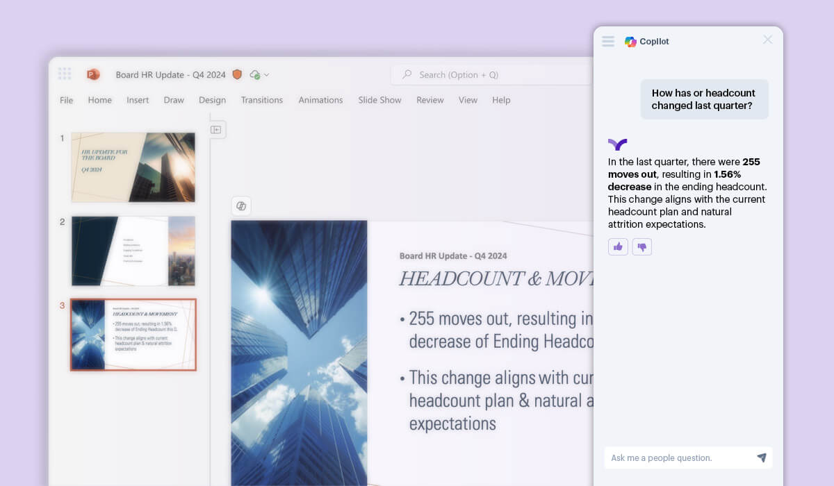 The CHRO of a construction materials distributor is preparing her quarterly update for the board using Microsoft PowerPoint. Typically, gathering all of the data she needs to include would require hours of preparation and coordination with multiple teams. Instead, she uses Microsoft 365 Copilot to ask questions about key metrics like headcount and can paste the answers (powered by Vee) directly into her slide deck without switching apps.